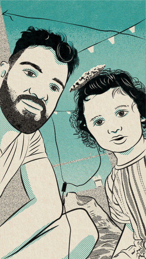 He lives with his wife—who, at the time of this writing, is pregnant with their first child—in the remains of a house that’s been heavily shelled by Israeli artillery.
